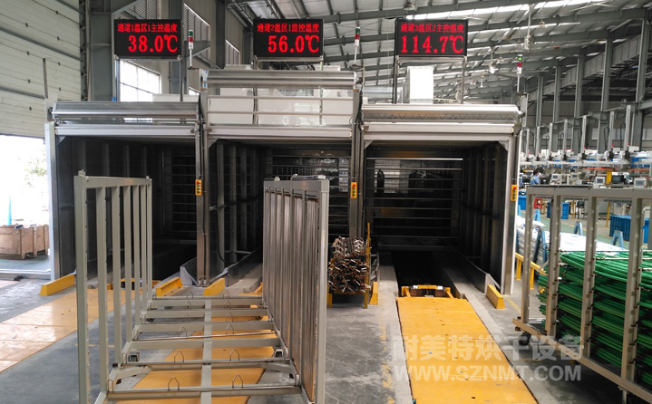 每個(gè)小車分10層堆放日豐管,每層放6包,則每車可放60包,每包重約28KG,烘烤區(qū)域分3個(gè)獨(dú)立通道,可以單獨(dú)控溫,每個(gè)通道烘烤區(qū)可以放置6輛小車,每個(gè)通道每20分鐘出一輛小車,小車自動(dòng)進(jìn)出。小車由客戶自行設(shè)計(jì)制作。
